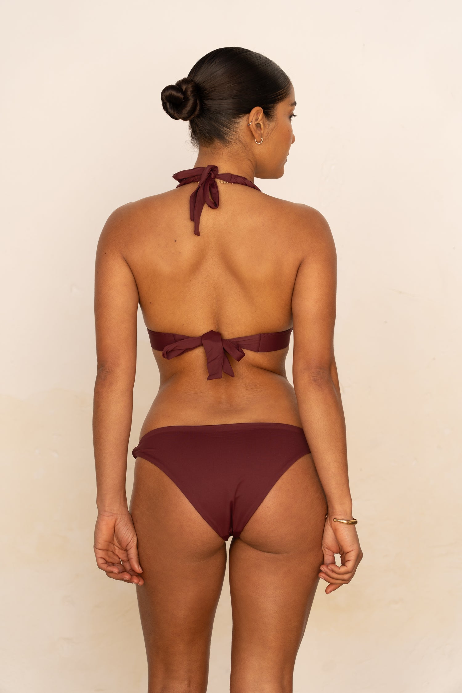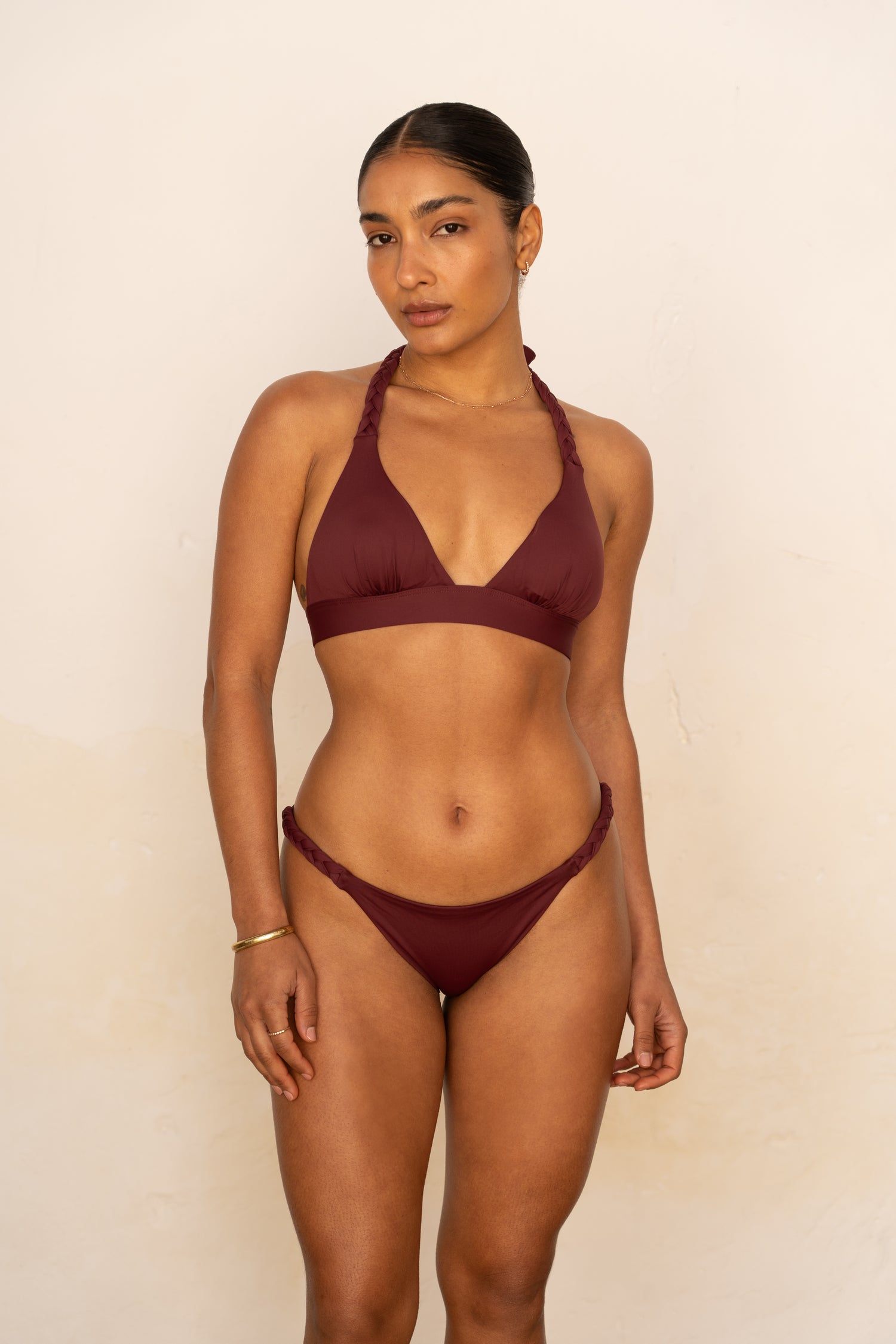 Jolie culotte taille basse aux détails tressés sur les hanches. Légèrement échancré au niveau des fesses. Le modèle est doublé dans la même matière, assurant opacité, confort et longévité à votre maillot de bain.