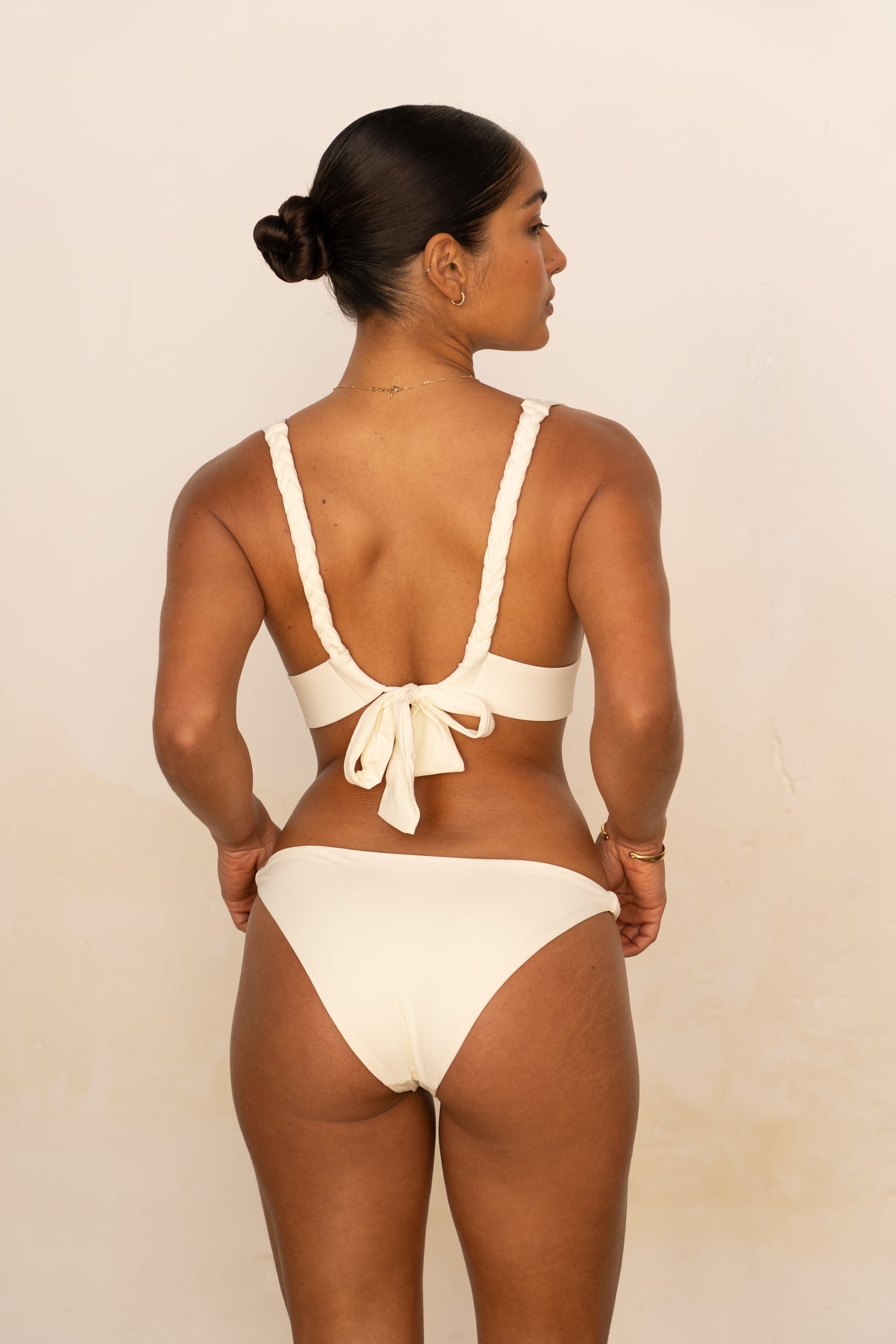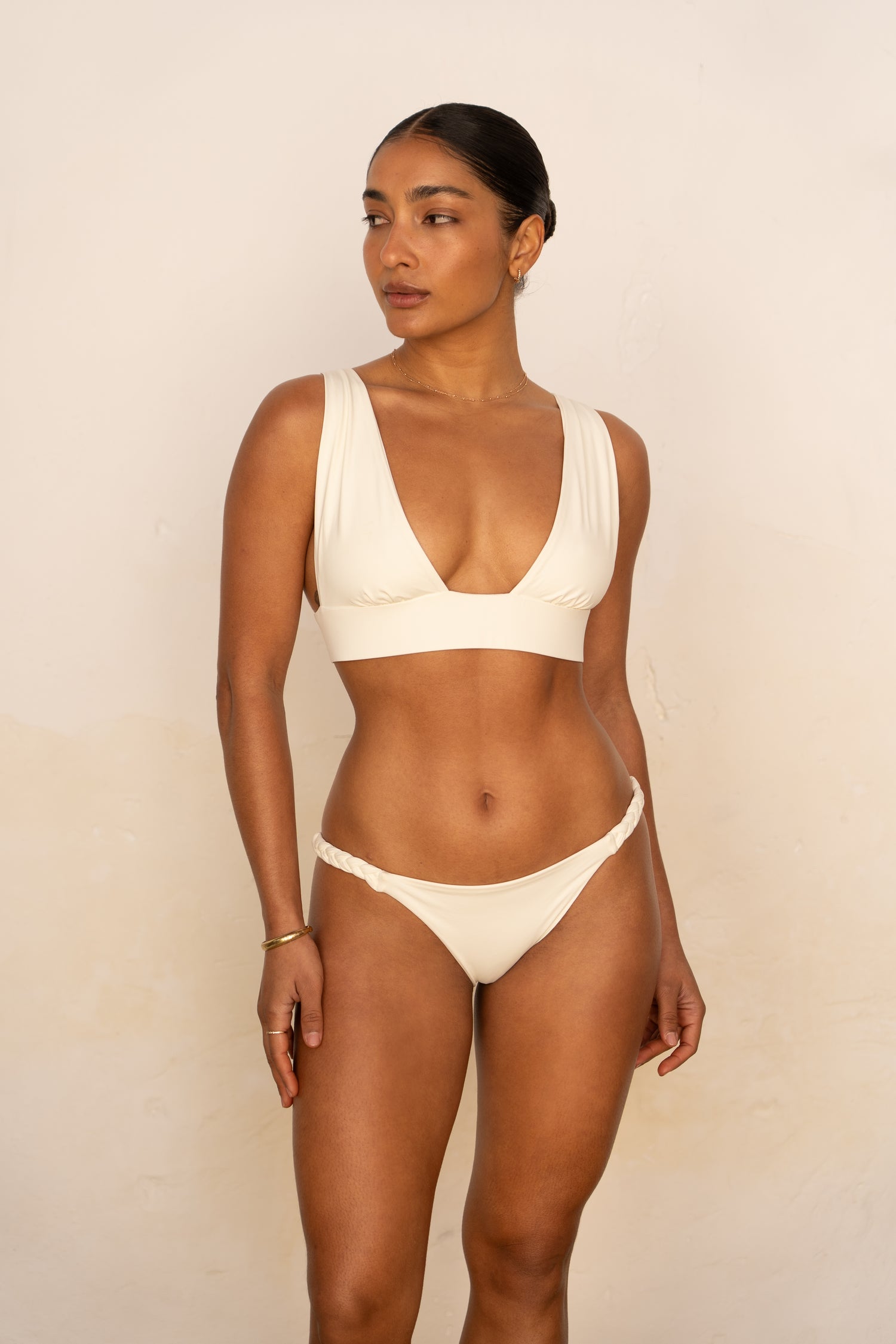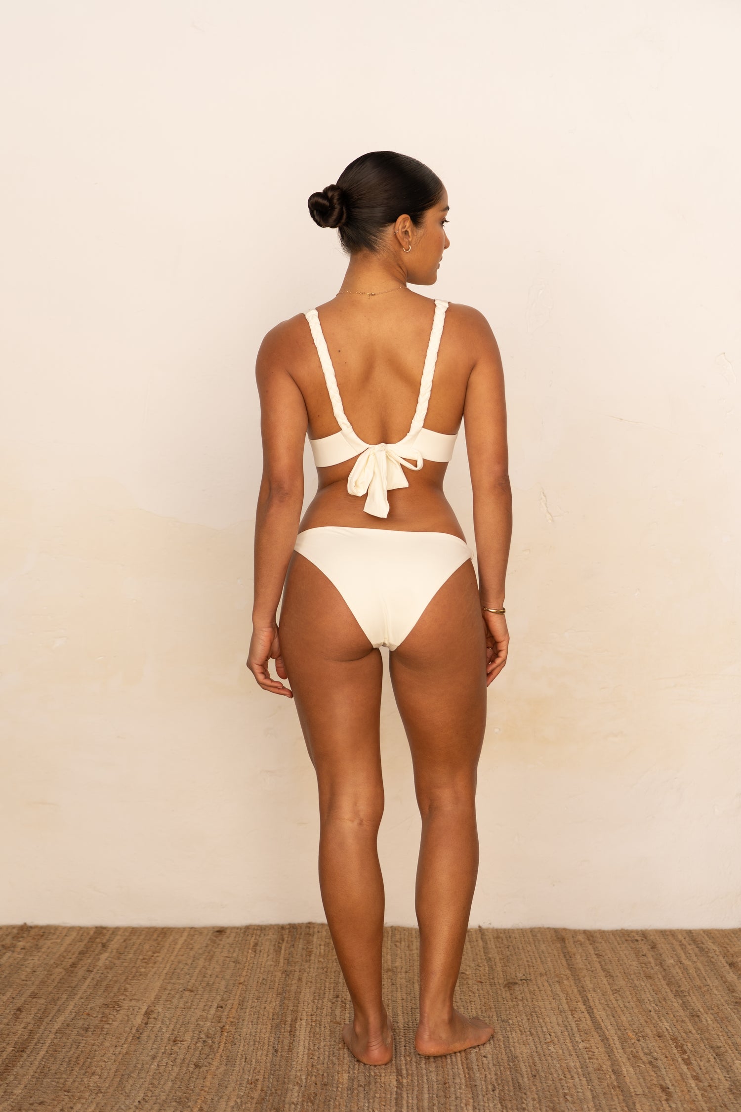 Le bas Mila met en valeur toutes les morphologies et peut se porter aussi bien en taille basse que plus haut sur les hanches. L'échancrure est modérée à l'avant et plus prononcée à l'arrière. Prenez votre taille habituelle de bas en lingerie / bain ou une taille au dessous si vous êtes entre deux tailles. Ketlein (mannequin brune) porte une taille S pour son 85B, 36 en bas et 1m60.
