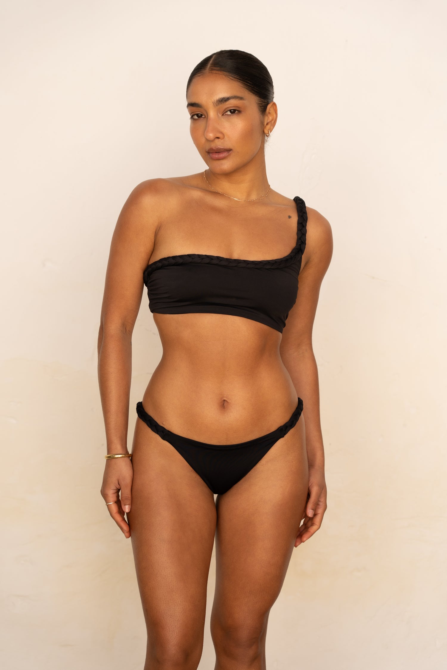 Forme bandeau asymétrique finie par une bretelle tressée à la main. Le haut Lisa convient particulièrement aux petites et moyennes poitrines. Le modèle est doublé dans la même matière, assurant opacité, confort et longévité à votre maillot de bain.