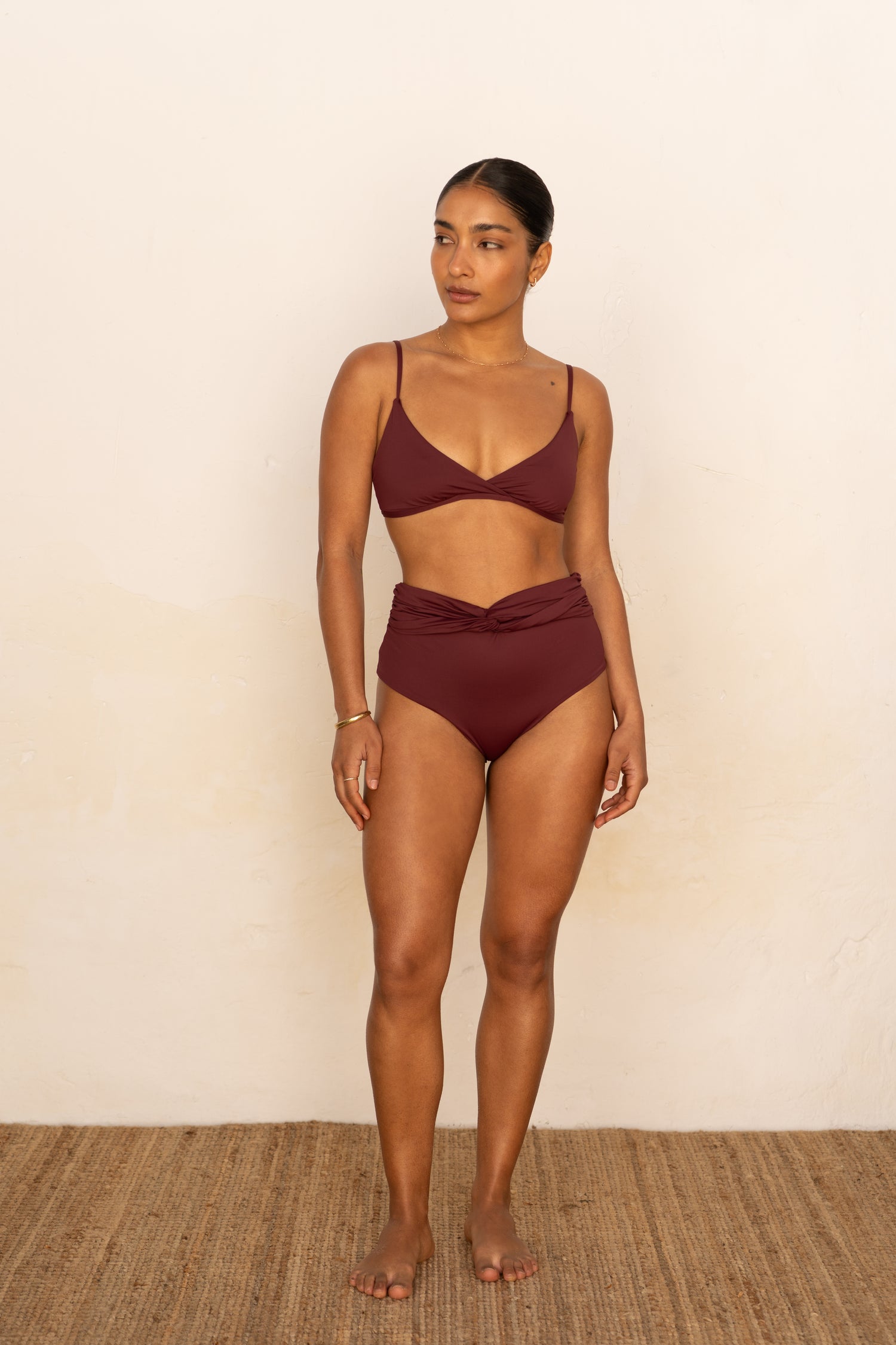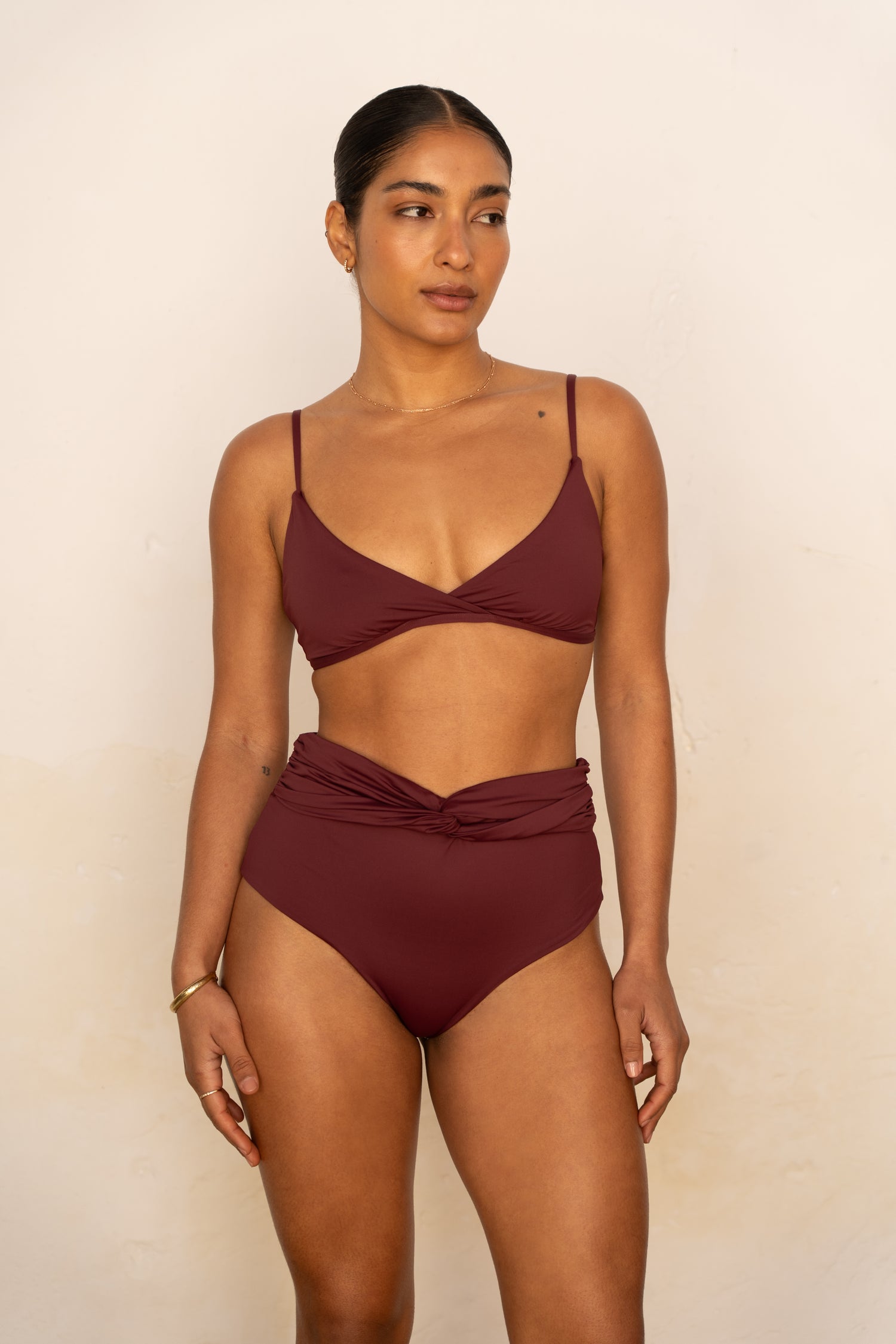 Le joli haut Pia se différencie grâce à sa finesse et sa simplicité. Sa forme cache-coeur offre un décolleté délicat et sensuel. Il se veut sobre pour accompagner le bas Matilda, une pièce forte aux finitions plus marquées.