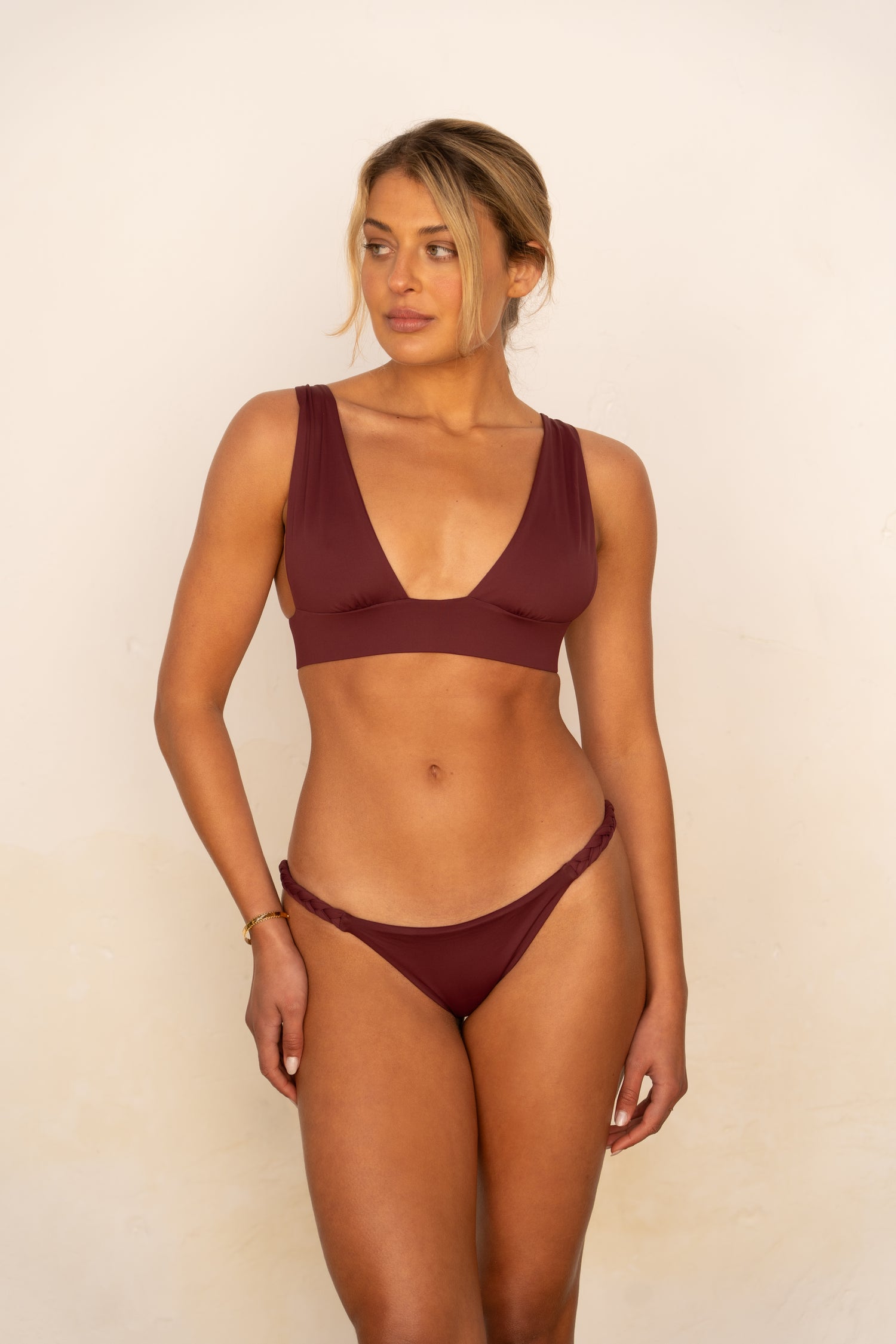 Haut à bandes larges, décolleté profond, fermé par des bretelles délicatement tressées dans le dos. La fermeture en noeud dans le dos permet un ajustement personnalisé à toute morphologie. Le modèle est doublé dans la même matière, assurant opacité, confort et longévité à votre maillot de bain.