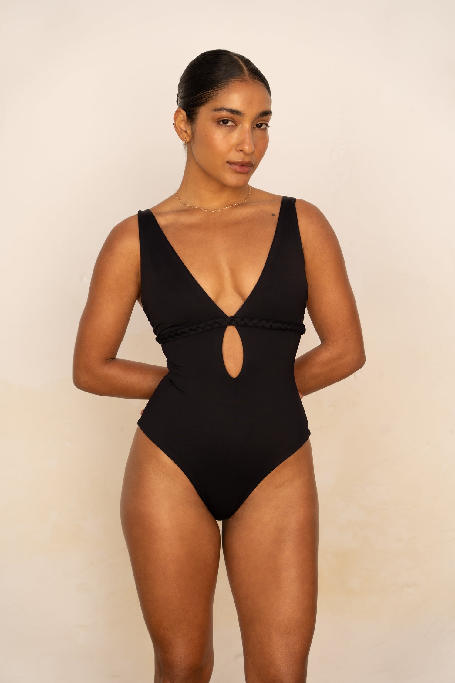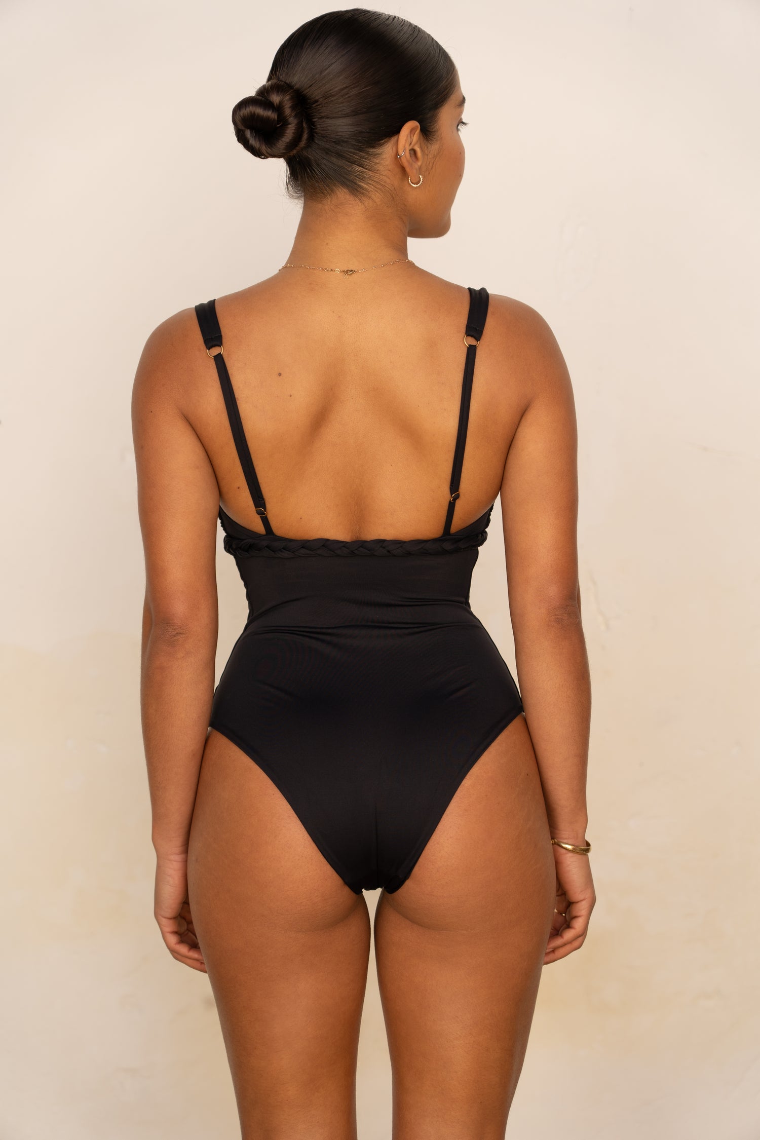 Le une Pièce Amélia reprend les codes Khaven : une forme élégante et un détail fort. Grâce à son détail tressé sous la poitrine, Amélia sublime toutes les poitrines et épouse les courbes.