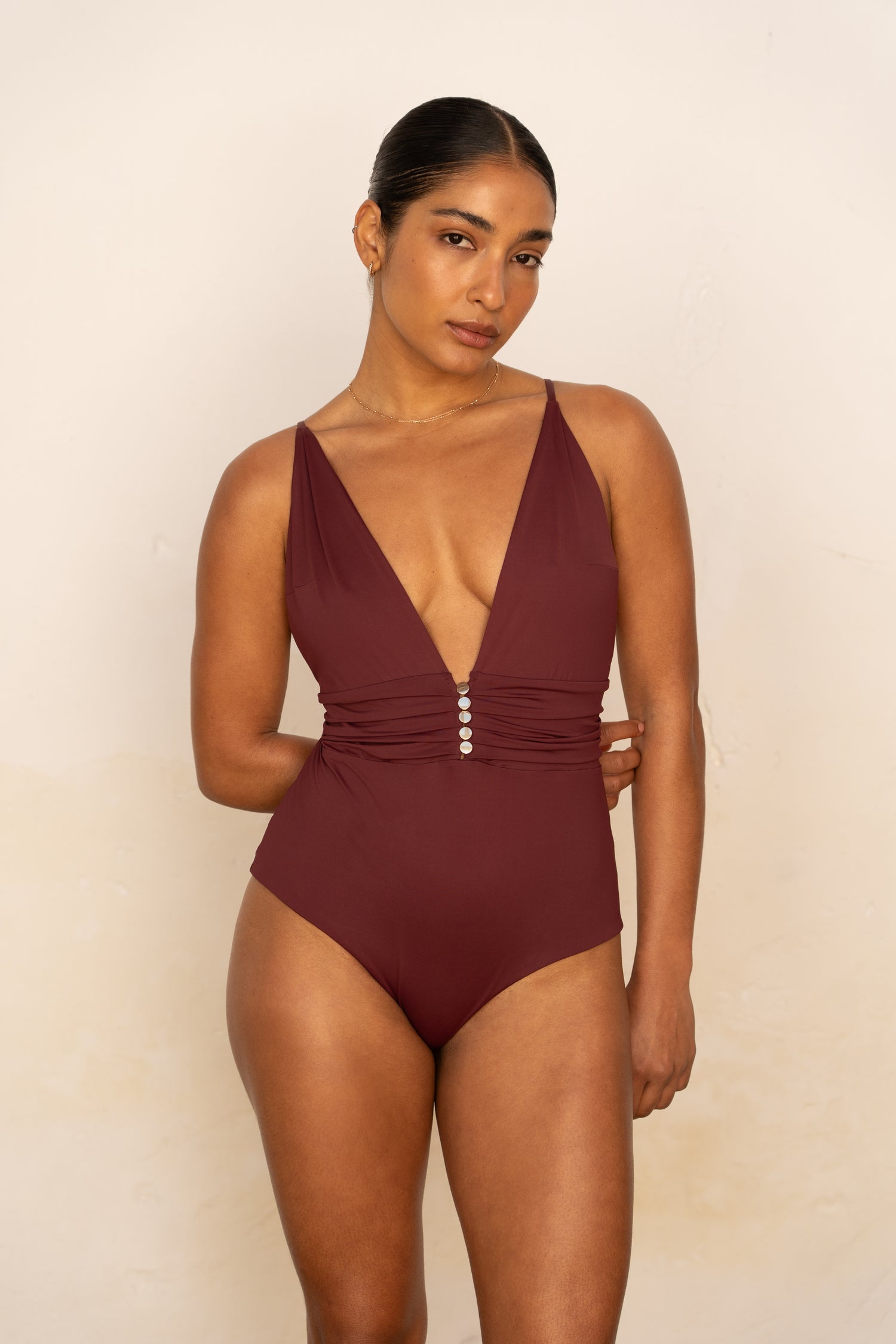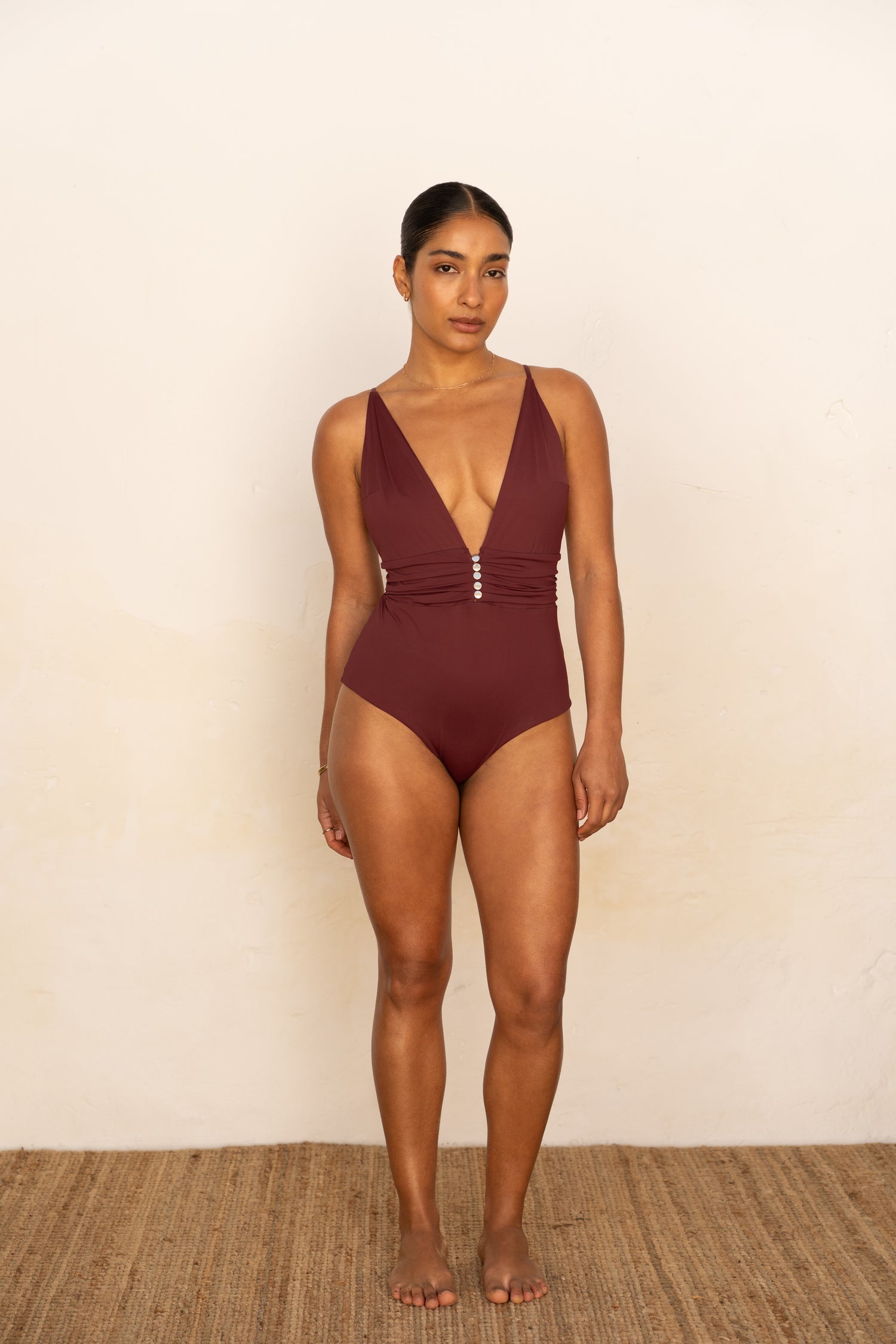 Une pièce triangle, échancrure profonde en V, accessoirisé d'une boutonnière dorée fonctionnelle. Il est croisé dans le dos pour assurer un bon maintien. Les bretelles réglables permettent d'ajuster le maillot. Le modèle est doublé dans la même matière, assurant opacité, confort et longévité à votre maillot de bain.