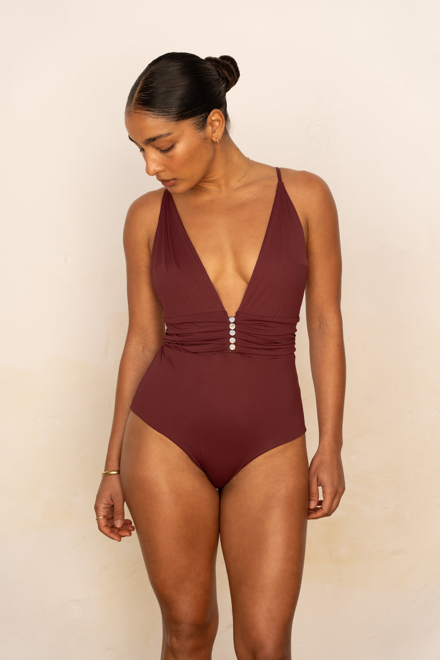 Son décolleté plongeant met particulièrement en valeur les poitrines A à C. Prenez votre taille habituelle de bas en lingerie. Astuce : Pensez à bien ouvrir la boutonnière pour enfiler le maillot de bain si vous sentez qu'il est trop serré pour passer les hanches Ketlein (mannequin brune) porte une taille S pour son 85B, 36 en bas et 1m60.